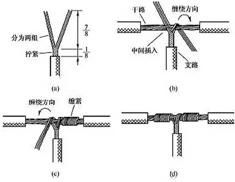 另一種方法如圖8所示,將支路芯線靠近絕緣層的約1/8芯線絞合擰緊,其余7/8芯線分為兩組[見圖8(a)],一組插入干路芯線當中,另一組放在干路芯線前面,并朝右邊按圖8(b)所示方向纏繞 4~5圈。再將插入干路芯線當中的那一組朝左邊按圖8(c)所示方向纏繞4~5圈,連接好的導線如圖8(d)所示。FKZ卷筒電纜_高柔性拖鏈電纜_機器人電纜生產廠家