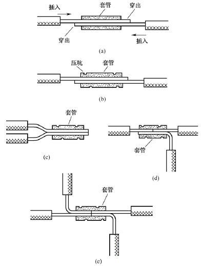 橢圓截面套管使用時,將需要連接的兩根導線的芯線分別從左右兩端相對插入并穿出套管少許,如圖14(a)所示,然后壓緊套管即可,如圖14(b)所示。橢圓截面套管不僅可用于導線的直線壓接,而且可用于同一方向導線的壓接,如圖14(c)所示;還可用于導線的T字分支壓接或十字分支壓接,如圖14(d)和圖14(e)所示。FKZ卷筒電纜_高柔性拖鏈電纜_機器人電纜生產廠家