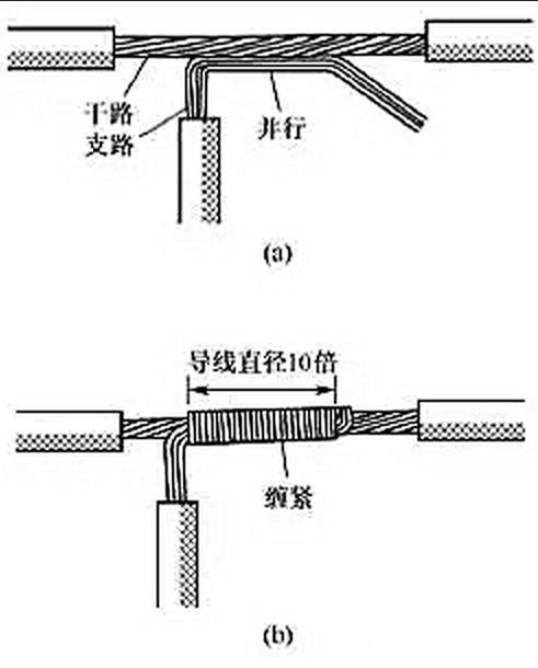 (4)多股銅導線的分支連接。多股銅導線的T字分支連接有兩種方法,一種方法是將支路芯線90°折彎后與干路芯線并行[見圖7(a)],然后將線頭折回并緊密纏繞在芯線上即可[見圖7(b)]。FKZ卷筒電纜_高柔性拖鏈電纜_機器人電纜生產廠家