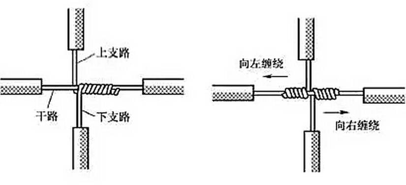 單股銅導線的十字分支連接如圖5所示,將上下支路芯線的線頭緊密纏繞在干路芯線上5~8圈后剪去多余線頭即可。可以將上下支路芯線的線頭向一個方向纏繞[見圖5(a)],也可以向左右兩個方向纏繞[見圖 5(b)]。FKZ卷筒電纜_高柔性拖鏈電纜_機器人電纜生產廠家