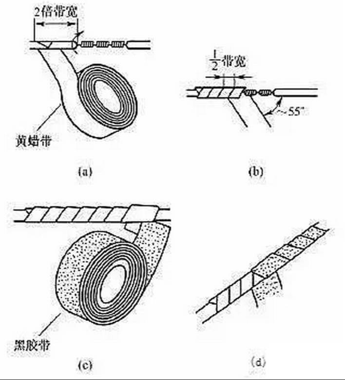 一字形連接的導線接頭可按圖20所示進行絕緣處理,先包纏一層黃蠟帶,再包纏一層黑膠布帶。將黃蠟帶從接頭左邊絕緣完好的絕緣層上開始包纏,包纏兩圈后進入剝除了絕緣層的芯線部分[見圖20(a)]。包纏時黃蠟帶應與導線成55°左右傾斜角,每圈壓疊帶寬的1/2[見圖20(b)],直至包纏到接頭右邊兩圈距離的完好絕緣層處。然后將黑膠布帶接在黃蠟帶的尾端,按另一斜疊方向從右向左包纏[見圖20(c)、圖20(d)],仍每圈壓疊帶寬的1/2,直至將黃蠟帶完全包纏住。包纏處理中應用力拉緊膠帶,注意不可稀疏,更不能露出芯線,以確保絕緣質量和用電安全。對于220V線路,也可不用黃蠟帶,只用黑膠布帶或塑料膠帶包纏兩層。在潮濕場所應使用聚氯乙烯絕緣膠帶或滌綸絕緣膠帶。FKZ卷筒電纜_高柔性拖鏈電纜_機器人電纜生產廠家